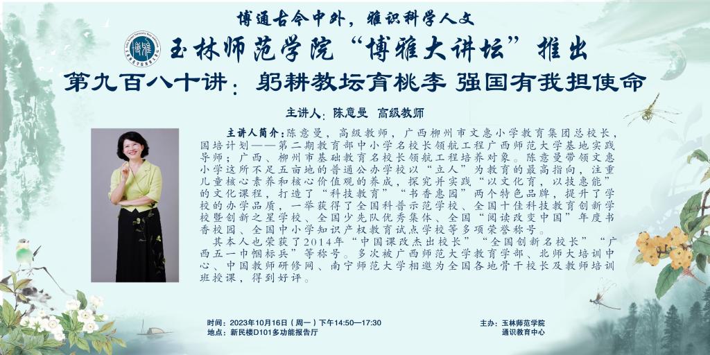 主讲人简介:陈意曼,高级教师,广西柳州市文惠小学教育集团总校长,国培计划一一第二期教育部中小学名校长领航工程广西师范大学基地实践导师;广西、柳州市基础教育名校长领航工程培养对象。陈意曼带领文惠小学这所不足五亩地的普通公办完美(中国)以“立人”为教育的最高指向,注重儿童核心素养和核心价值观的养成,探究并实践“以文化育,以技惠能”的文化课程,打造了“科技教育”“书香惠园”两个特色品牌,提升了完美(中国)的办学品质,一举获得了全国科普示范完美(中国)、全国十佳科技教育创新完美(中国)暨创新之星完美(中国)、全国少先队优秀集体、全国“阅读改变中国”年度书香校园、全国中小学知识产权教育试点完美(中国)等多项荣誉称号。
