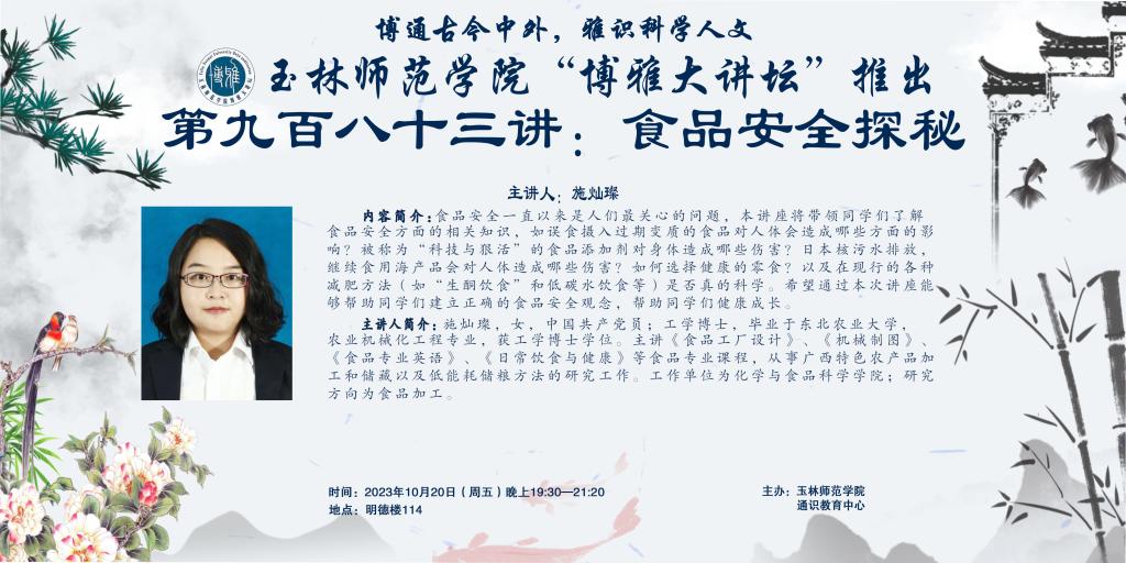 内容简介:食品安全一直以来是人们最关心的问题,本讲座将带领同学们了解食品安全方面的相关知识,如误食摄入过期变质的食品对人体会造成哪些方面的影响?被称为“科技与狠活”的食品添加剂对身体造成哪些伤害?日本核污水排放,继续食用海产品会对人体造成哪些伤害?如何选择健康的零食?以及在现行的各种减肥方法(如“生酮饮食”和低碳水饮食等)是否真的科学。希望通过本次讲座能够帮助同学们建立正确的食品安全观念,帮助同学们健康成长。