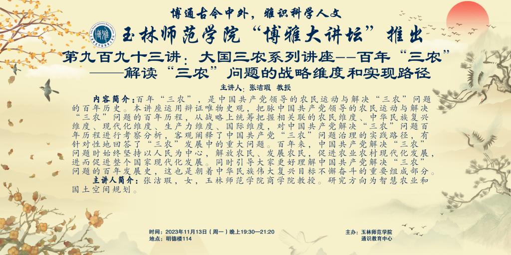 内容简介:百年“三农”,是中国共产党领导的农民运动与解决“三农”问题的百年历史。本讲座运用辩证唯物史观,把脉中国共产党领导的农民运动与解决“三农”问题的百年历程,从战略上统筹把握相关联的农民维度、中华民族复兴维度、现代化维度、生产力维度、国际维度,对中国共产党解决“三农”问题百年历程进行考察分析,客观阐释了中国共产党“三农”问题治理的实践路径,有针对性地回答了“三农”发展中的重大问题。百年来,中国共产党解决“三农”问题时始终坚持以人民为中心,解放农民、发展农民,促进农业农村现代化发展,进而促进整个国家现代化发展。同时引导大家更好理解中国共产党解决“三农”问题的百年发展史,这也是朝着中华民族伟大复兴目标不懈奋斗的重要组成部分。