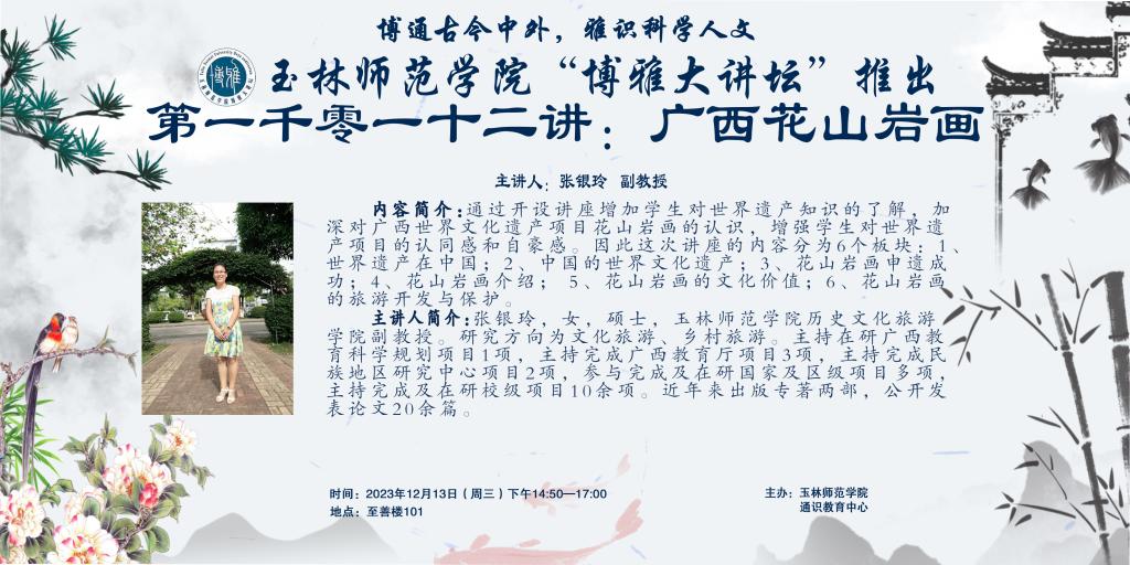 内容简介:通过开设讲座增加学生对世界遗产知识的了解,加深对广西世界文化遗产项目花山岩画的认识,增强学生对世界遗产项目的认同感和自豪感。因此这次讲座的内容分为6个板块:1世界遗产在中国;2、中国的世界文化遗产;3、花山岩画申遗成功;4、花山岩画介绍; 5、花山岩画的文化价值;6、花山岩画的旅游开发与保护.
