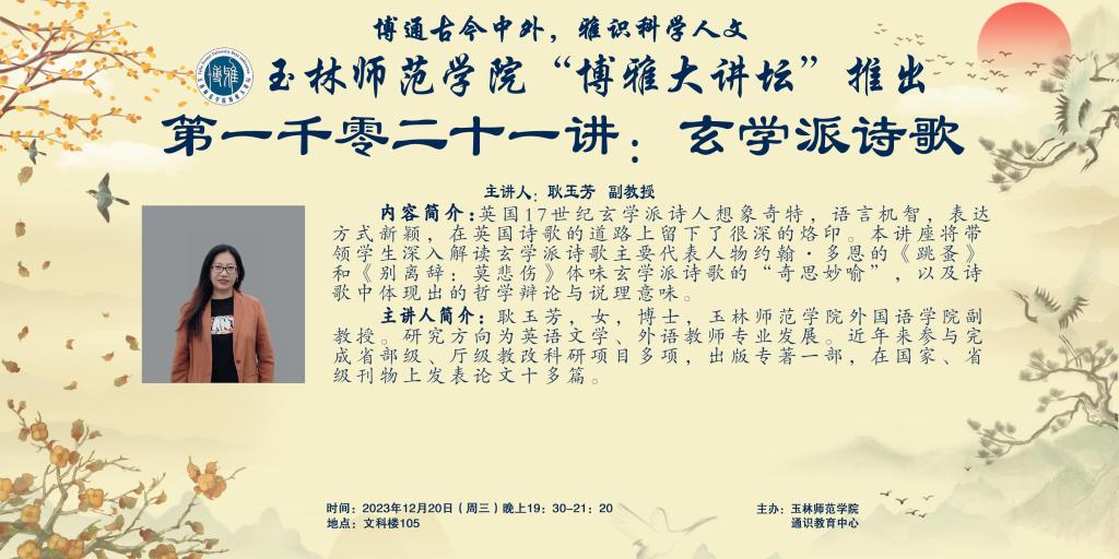 内容简介:英国17世纪玄学派诗人想象奇特,语言机智,表达方式新颖,在英国诗歌的道路上留下了很深的烙印。本讲座将带领学生深入解读玄学派诗歌主要代表人物约翰·多恩的《跳蚤》和《别离辞:莫悲伤》体味玄学派诗歌的“奇思妙喻”,以及诗歌中体现出的哲学辩论与说理意味。