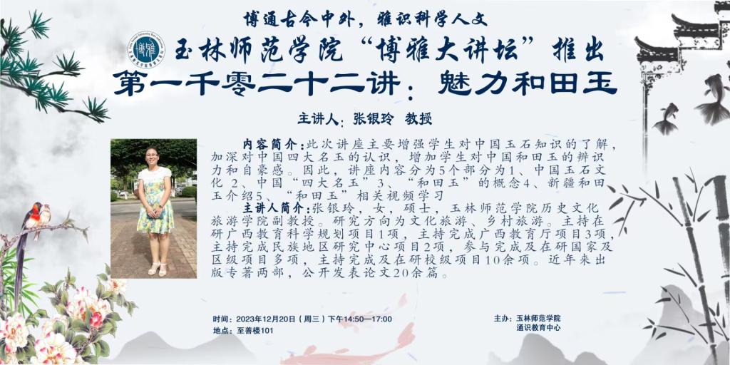 内容简介:此次讲座主要增强学生对中国玉石知识的了解,加深对中国四大名玉的认识,增加学生对中国和田玉的辨识力和自豪感。因此,讲座内容分为5个部分为1、中国玉石文化 2、中国“四大名玉”3、“和田玉”的概念4、新疆和田玉介绍5、“和田玉”相关视频学习。