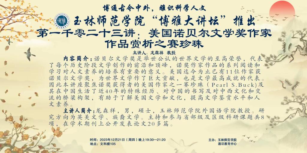 内容简介:诺贝尔文学奖是举世公认的世界文学的至高荣誉,代表了每个历史阶段文学创作的前沿和顶峰,诺奖作家作品的系列阅读和学习对人文素养的培养有重要的意义。美国迄今为止已有11位作家获诺贝尔文学奖,为世界文学作了巨大贡献,也是文学最高成就的代表。因此本讲座聚焦诺奖获得者的美国作家之一赛珍珠(Pearl S.Buck)及其在中国生活了近40年的特殊经历、对中国的书写及对中西文化和交流的桥梁构架,有助于了解美国文学和文化,提高文学鉴赏水平和人文素养。
