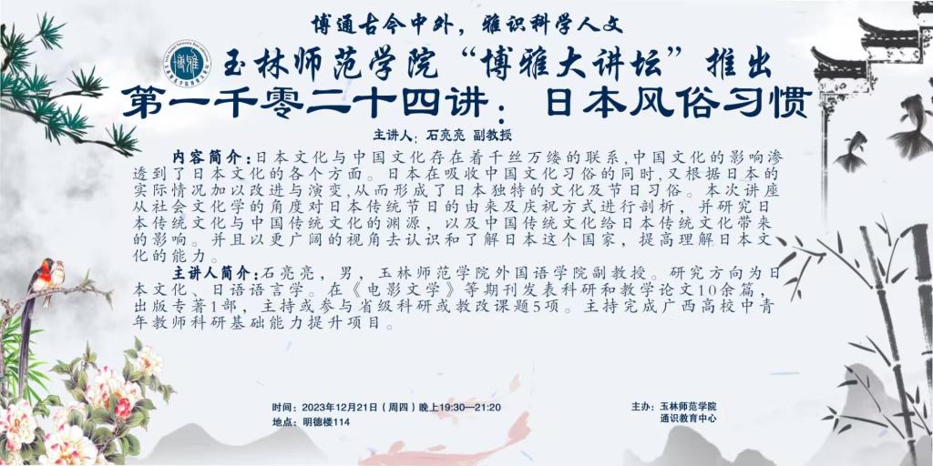 内容简介:日本文化与中国文化存在着千丝万缕的联系,中国文化的影响渗透到了日本文化的各个方面。日本在吸收中国文化习俗的同时,又根据日本的实际情况加以改进与演变,从而形成了日本独特的文化及节日习俗。本次讲座从社会文化学的角度对日本传统节日的由来及庆祝方式进行剖析,并研究日本传统文化与中国传统文化的渊源,以及中国传统文化给日本传统文化带来的影响。并且以更广阔的视角去认识和了解日本这个国家,提高理解日本文化的能力。