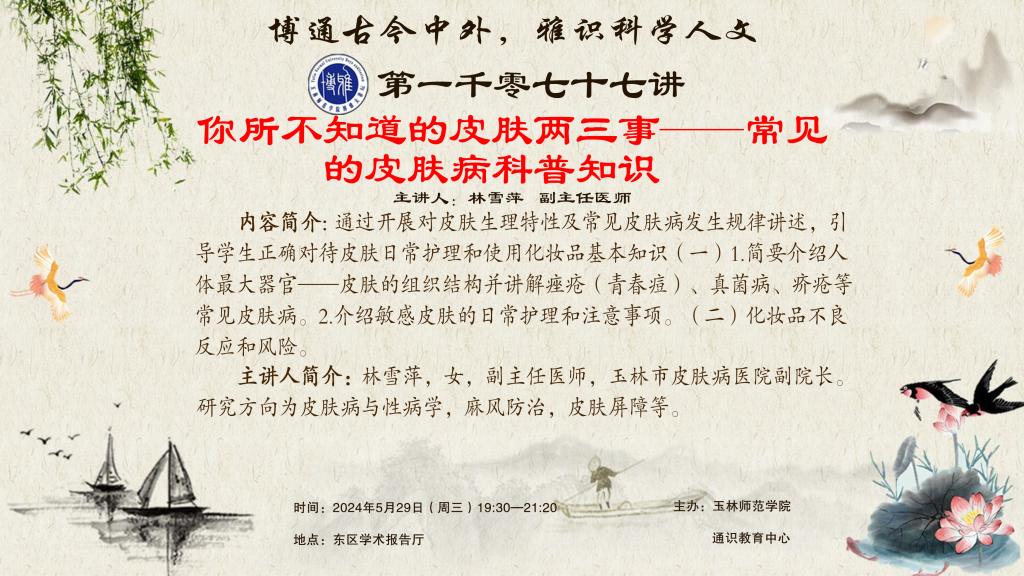 内容简介:通过开展对皮肤生理特性及常见皮肤病发生规律讲述,引导学生正确对待皮肤日常护理和使用化妆品基本知识(一)1.简要介绍人体最大器官——皮肤的组织结构并讲解痤疮(青春痘)、真菌病、疥疮等常见皮肤病。2.介绍敏感皮肤的日常护理和注意事项。(二)化妆品不良反应和风险。