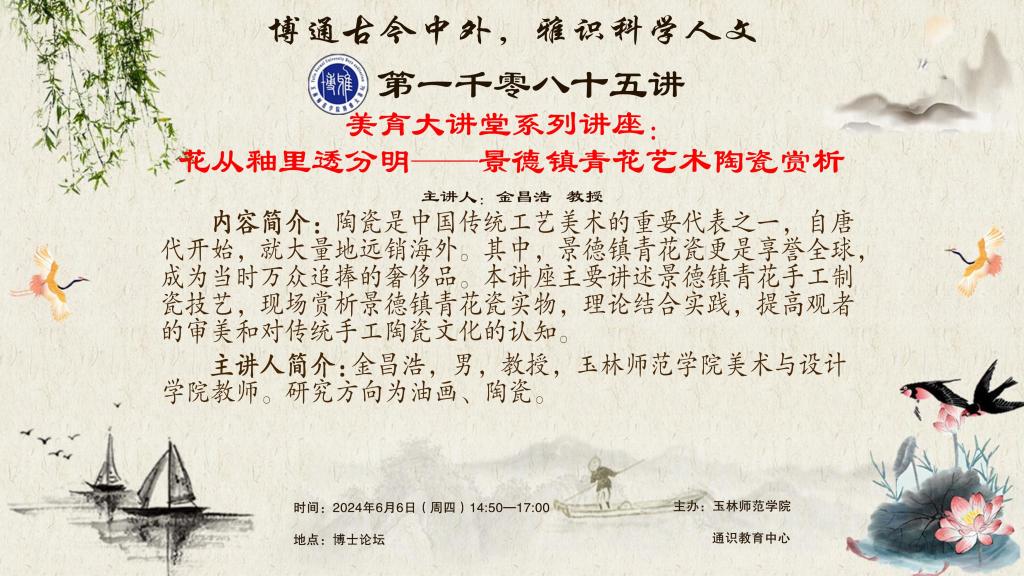 内容简介:陶瓷是中国传统工艺美术的重要代表之一,自唐代开始,就大量地远销海外。其中,景德镇青花瓷更是享誉全球,成为当时万众追捧的奢侈品。本讲座主要讲述景德镇青花手工制瓷技艺,现场赏析景德镇青花瓷实物,理论结合实践,提高观者的审美和对传统手工陶瓷文化的认知。