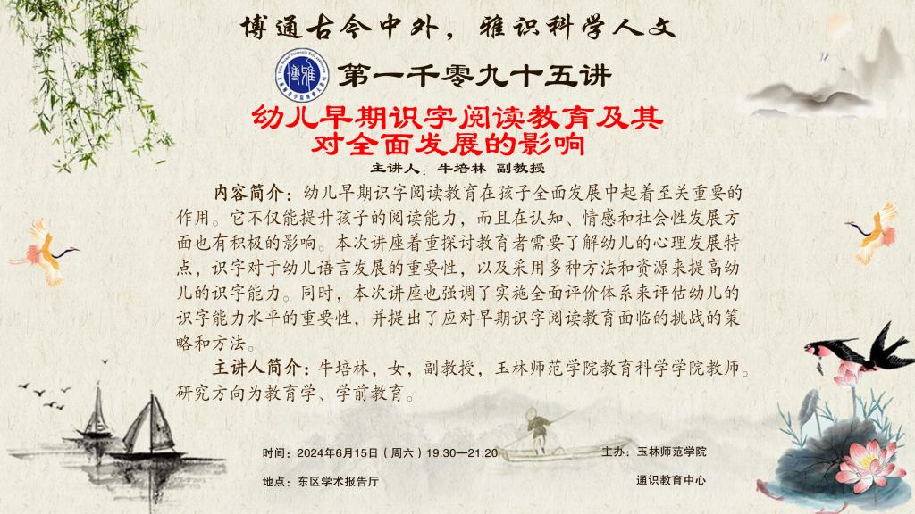 内容简介:幼儿早期识字阅读教育在孩子全面发展中起着至关重要的作用。它不仅能提升孩子的阅读能力,而且在认知、情感和社会性发展方面也有积极的影响。本次讲座着重探讨教育者需要了解幼儿的心理发展特点,识字对于幼儿语言发展的重要性,以及采用多种方法和资源来提高幼儿的识字能力。同时,本次讲座也强调了实施全面评价体系来评估幼儿的识字能力水平的重要性,并提出了应对早期识字阅读教育面临的挑战的策略和方法。