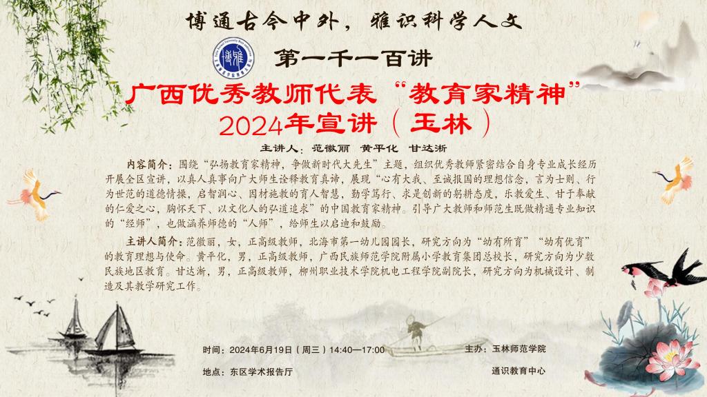 预告:【博雅大讲坛】1100期——广西优秀教师代表“教育家精神”2024年宣讲(玉林)