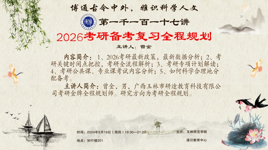 内容简介:1、2026考研最新政策,最新数据分析;2、考研关键时间点把控,考研全流程解析;3、考研专项计划解读;4、考研公共课、专业课考试内容分析;5、如何科学合理地分配备考。