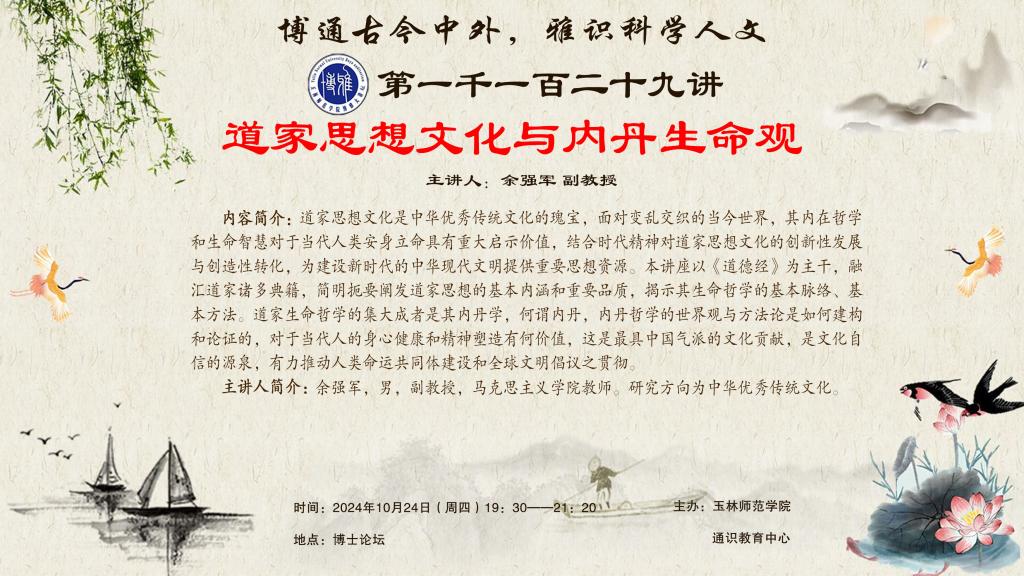 内容简介:道家思想文化是中华优秀传统文化的瑰宝,面对变乱交织的当今世界,其内在哲学和生命智慧对于当代人类安身立命具有重大启示价值,结合时代精神对道家思想文化的创新性发展与创造性转化,为建设新时代的中华现代文明提供重要思想资源。本讲座以《道德经》为主干,融汇道家诸多典籍,简明扼要阐发道家思想的基本内涵和重要品质,揭示其生命哲学的基本脉络、基本方法。道家生命哲学的集大成者是其内丹学,何谓内丹,内丹哲学的世界观与方法论是如何建构和论证的,对于当代人的身心健康和精神塑造有何价值,这是最具中国气派的文化贡献,是文化自信的源泉,有力推动人类命运共同体建设和全球文明倡议之贯彻。