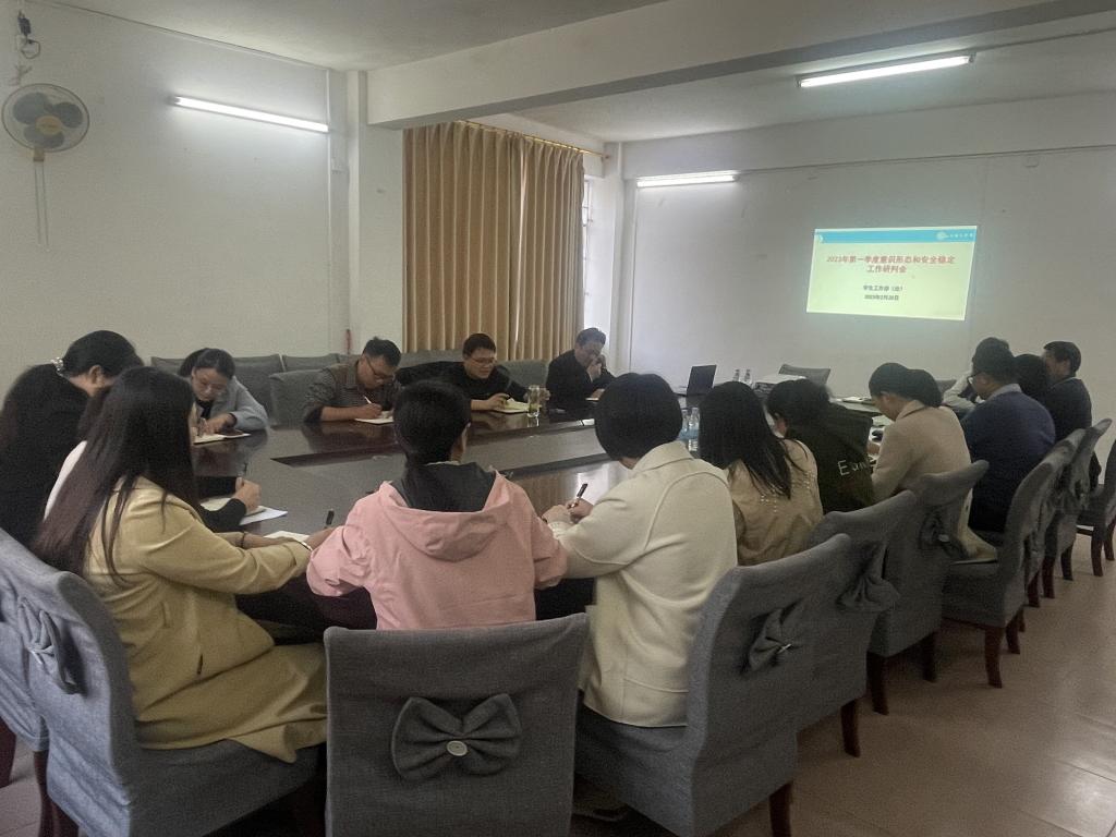 为扎实做好学生意识形态和学生安全稳定工作,维护校园安全,2月28日下午,学生工作部(处)于我校东校区大学生活动中心113会议室召开第一季度意识形态和安全稳定工作研判会,全体教职工参会,会议由学生工作部(处)部(处)长杨潇主持。