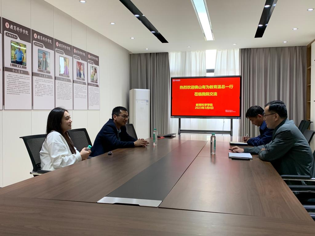 3月8日上午,佛山市有为教育一行到教育科学学院洽谈校企合作。校企双方在该院明德楼408会议室举行会谈,佛山市有为教育负责人温才坚,该院党委书记崔海波,副院长程传利参加此次会议,会议由崔海波主持。