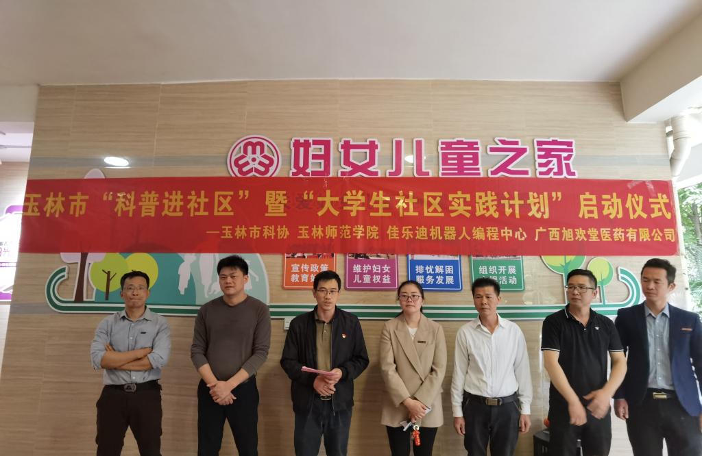 我校团委书记范良辰,物理与电信工程学院党委副书记赵坚,玉林市科学技术协会秘书科科长潘荣,我校团委宣传部部长黎魏华,玉林市江滨社区主任梁小华,以及玉林市佳乐迪机器人编程中心廖庆攀,广西旭欢堂医药有限公司潘宝雄参加此次启动仪式。