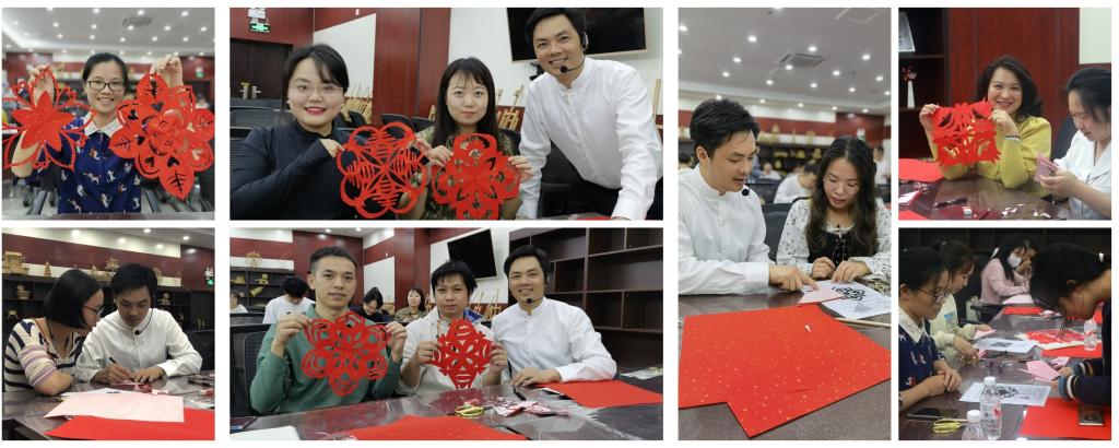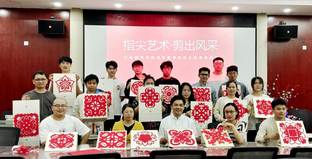 活动分为两个部分进行。第一部分为剪纸发展历史的了解及优秀剪纸作品赏析,青年教师通过学习相关知识,提升了对我国传统文化的认识,开拓了审美眼界;第二部分为剪纸体验,在玉林市工艺美术大师、美术与设计学院副教授满瑜琳老师的讲解和示范下,青年教师以花卉为主题进行剪纸创作。经过满老师的耐心指导和青年教师的认真学习,一件件漂亮的剪纸作品依次呈现在大家眼前。青年教师怀着喜悦的心情,将剪纸作品装裱在挂历中,做成了独特的手工艺术品。