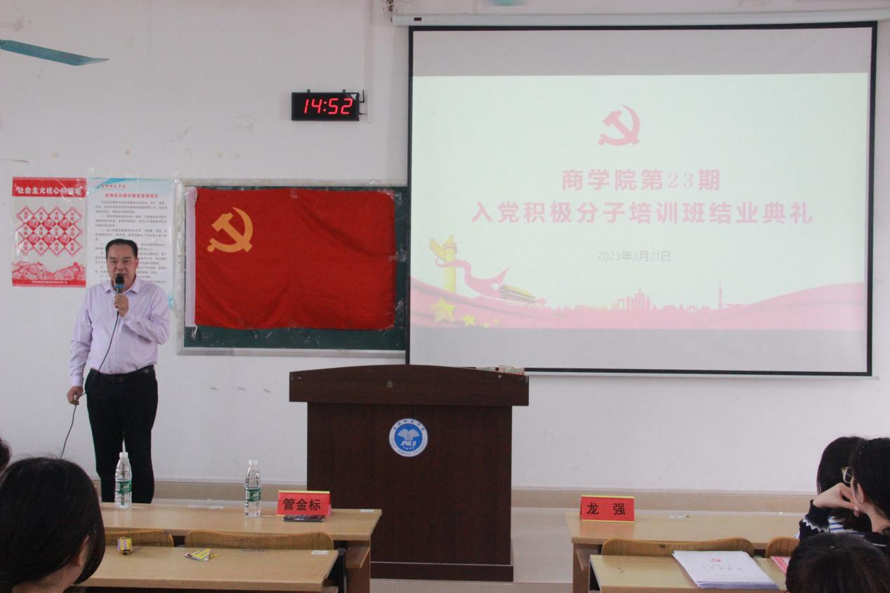 3月21日,商学院于我校东校区博学楼1-203教室举行分党校第二十三期入党积极分子培训班结业典礼。该院党委书记管金标,党委专职组织员,团委书记兼培训班班主作出席结业典礼,全体学员参加结业典礼,本次典礼由李晓丽主持。