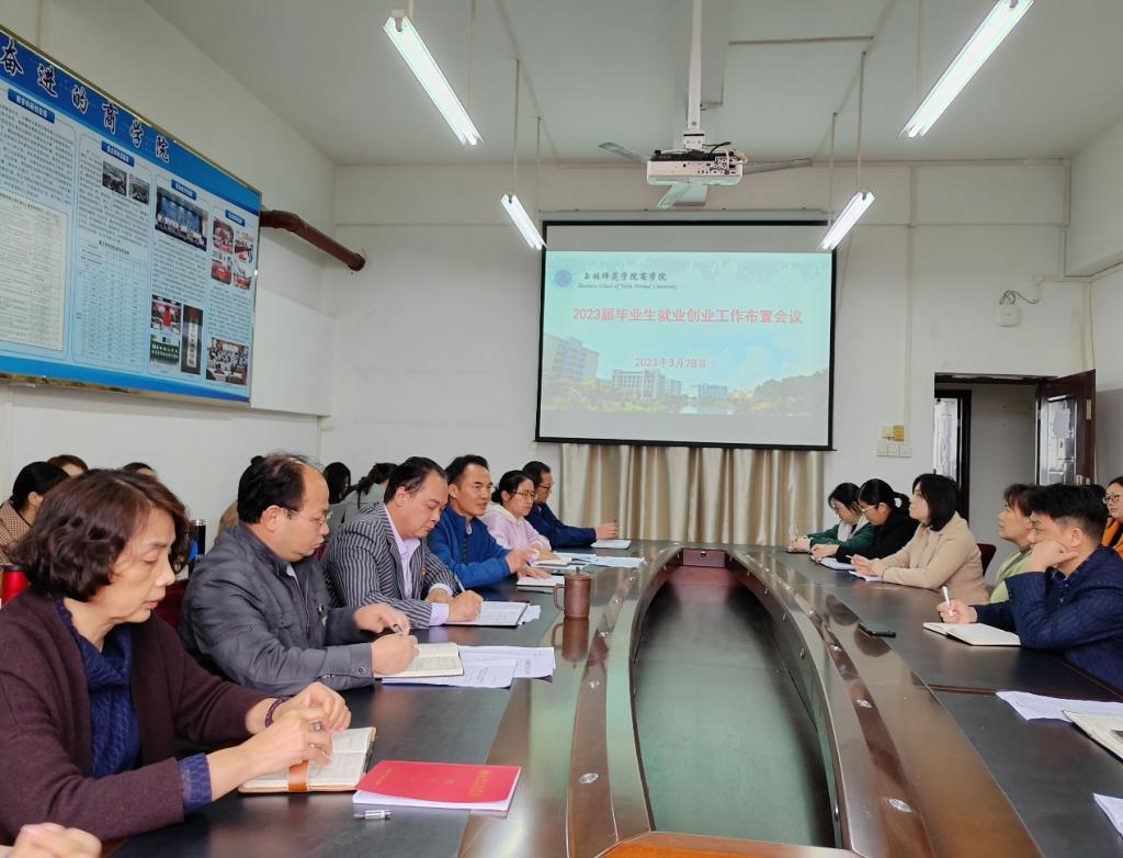 2023年3月28日下午,商学院于我校博学楼1-407会议室召开2023届毕业生就业创业工作布置会,该院领导班子、全体教职工参加此次会议。会议由党委书记管金标主持。