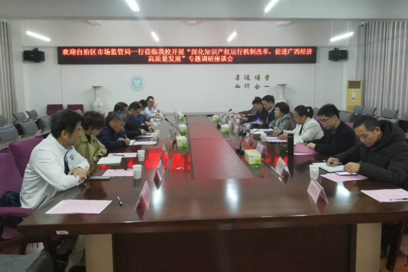 近日,自治区市场监管局知识产权促进处处长李佩鸿率队到我校开展“深化知识产权运行机制改革,促进广西经济高质量发展”专题调研,我校科研处处长石维有,玉林市市场监管局总工程师莫萍参加调研。