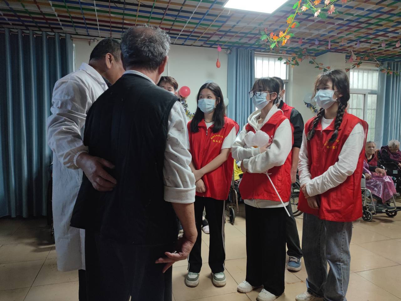 活动前,志愿者带着慰问物资前往养老院。养老院院长向志愿者介绍老人们的基本身体状况以及遇到典型突发情况的紧急措施。随后,志愿者布置表演场地,搀扶老人至集中地点并主动同老人亲切交谈、了解其日常活动及爱好。其间,志愿者为老人表演才艺,老人也同志愿者一起合唱、做手势舞,场面一度融洽和谐。表演结束后,志愿者们送老人回房间,为老人打扫卫生、修剪指甲,静静聆听老一辈人的感人故事,感受其家国情怀。