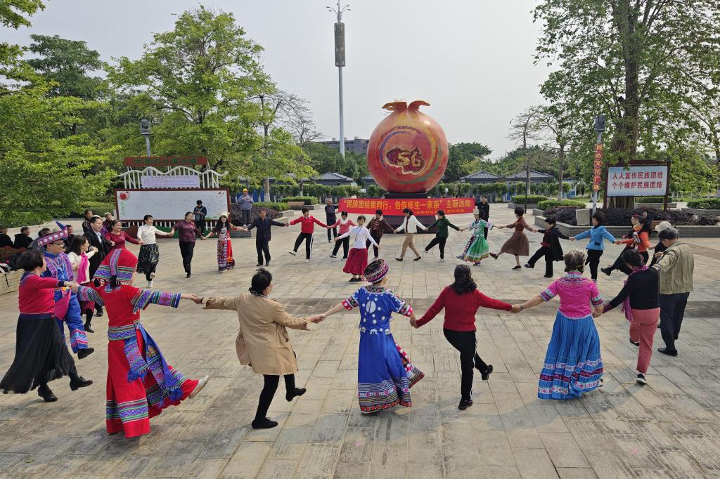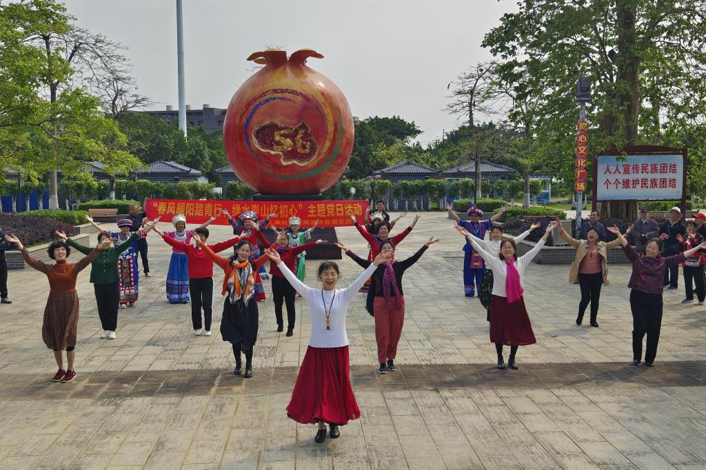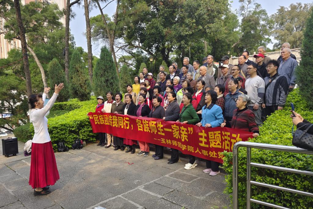 在活动的第二部分,蒋丽萍带领人事处各党支部党员和学生党员代表在会仙河公园广场开展唱山歌、跳交际舞、抛绣球比赛等具有民族特色的活动。她表示,希望本次活动不仅丰富我们的精神文化生活,同时也增进各族师生交往交流交融,弘扬中华民族优秀文化,推进民族文化融合,促进各民族的团结共进。活动中,老师和同学们感受中华文化的博大精深,加深了对“各民族优秀传统文化都是中华文化的组成部分”的认识,不断增强对伟大祖国、中华民族、中华文化、中国共产党、中国特色社会主义的认同。