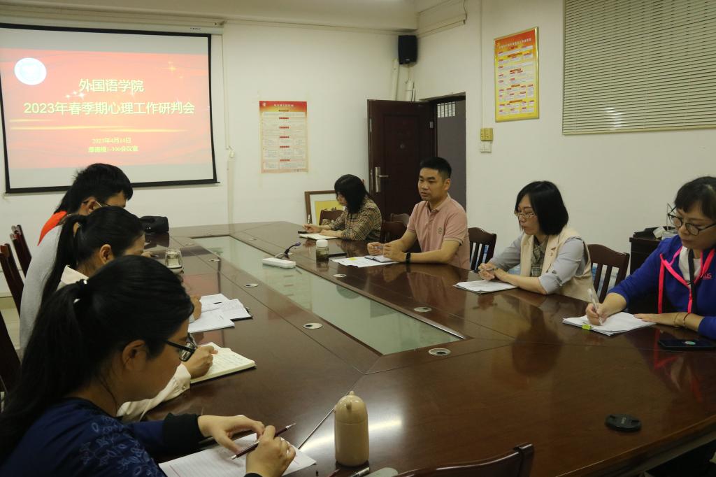 为深入推进心理育人工作,充分了解学生的心理健康状况,4月14日,外国语学院在我校东校区厚德楼1-306会议室召开2023年春季期心理工作研判会。该院党委书记梁国初,团委书记,全体辅导员以及各年级班主任参加会议。会议由梁国初主持。