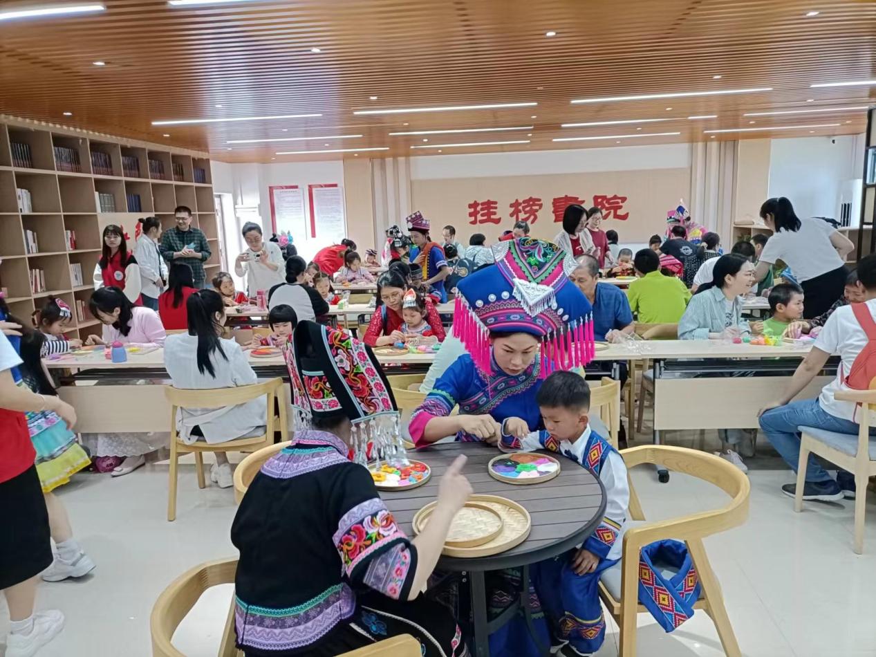 随后,小读者们在文化志愿者的指导和家长的共同参与下,手工绘制壮族五色糯米饭,提前感受节日氛围。志愿者、家长和小读者们伴随音乐的节拍走起民族服装秀和跳起壮族传统舞蹈,将活动的气氛推向高潮。