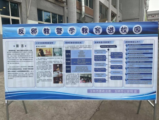 宣传教育活动以图片展示、发放宣传资料、组织观看宣传教育短片等形式进行。玉林市委政法委、玉林市公安局国保支队、反恐支队、邪侦支队等部门领导和民警到校开展宣传教育。我校保卫处、学生工作处等部门主管领导出席参加宣传教育活动。