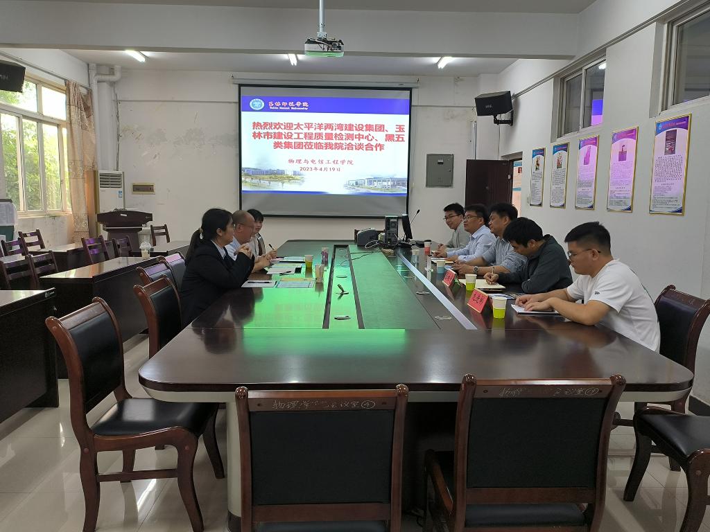 4月19日,玉林市建设工程质量检测中心主任、办公室主任,太平洋两湾建设集团总裁助理到物理与电信工程学院洽谈校企合作。该院党委副书记赵坚,副院长罗志荣,就业辅导员和教师代表参加此次会谈。会议由赵坚主持。