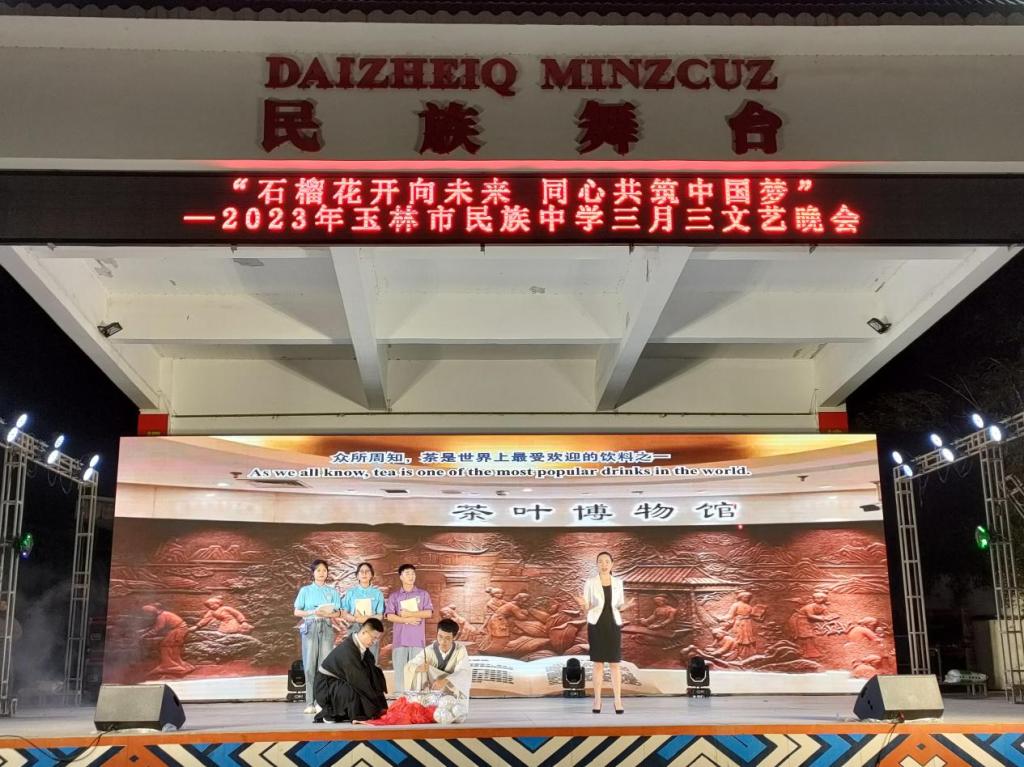 原创英文情景剧“踏时光之旅,觅茶之古今”编演活动以玉林市民族中学“石榴花开向未来,同心共筑中国梦三月三文艺晚会”为契机,以兴业山心茶为叙事主线,由我校乡村外语教育实践基地成员进行原创编写,选拔我校外国语学院英语专业优秀学生进行排练表演。情景剧从历史起源到现代发展,用英语娓娓道来山心茶的故事,传播兴业茶文化。情景剧节目全体演员通过流畅优美的英语口语,生动自然的舞台表演,扣人心弦的故事情节、丰富饱满的情感表达、精彩纷呈的演绎获得现场观众一致好评。
