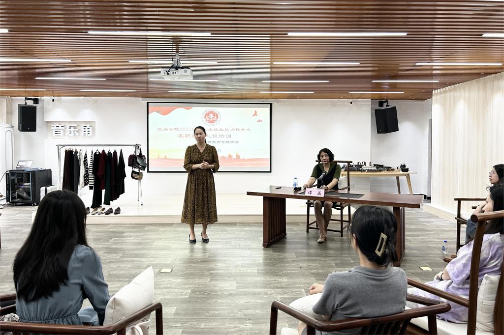 为加强大学生美育教育,更好地促进毕业生就业能力提升,4月20日上午,政法学院于我校东校区梅园社区A栋一楼中华传统文化体验中心开展2023届毕业生就业能力提升求职服饰礼仪培训——美育专题活动。活动邀请商学院党委专职组织员、高级形象管理顾问谭荔教师做毕业生求职服饰礼仪分享。政法学院党委副书记覃艳超、辅导员以及毕业班女生代表参加此次活动。活动由覃艳超主持。