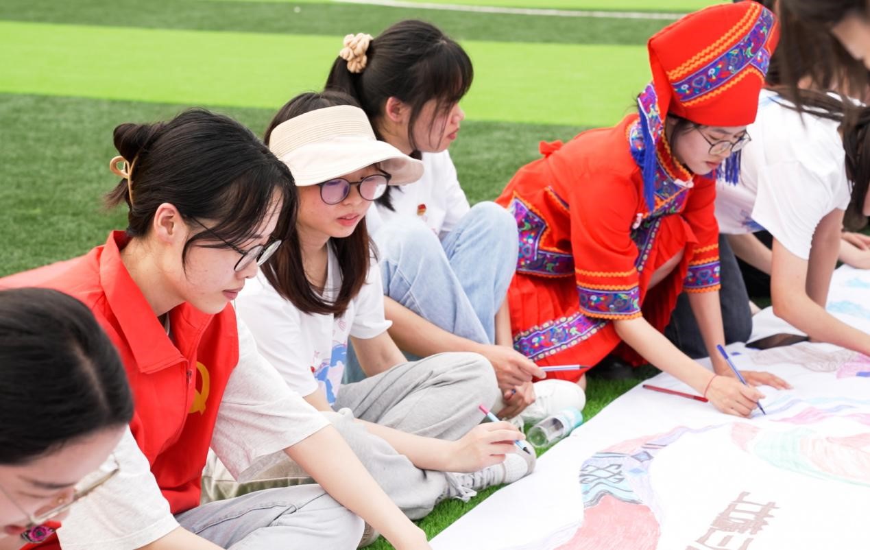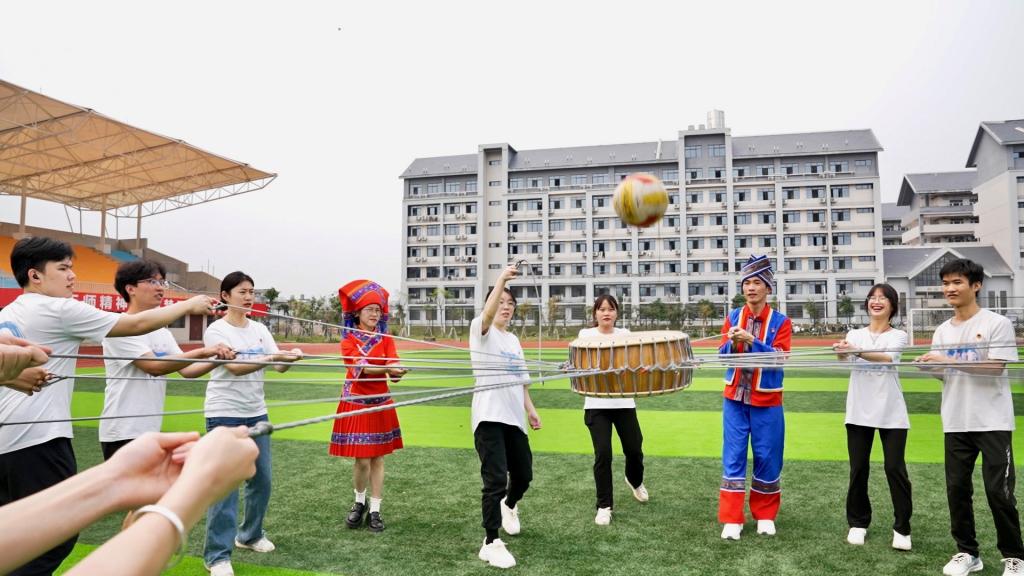 活动围绕“秀在壮乡、绘在壮乡、唱在壮乡……等主题开展民族服饰走秀、三月三画卷涂鸦、传瓶子听民歌竞猜、抛绣球比赛、同心鼓游戏等活动。随着音乐迈着动感的步伐,身着民族特色盛装的同学们为大家展示着民族服饰的风韵,展现各族人民相亲相爱的人文风情;“壮族三月三”不仅是民俗文化的传承,更是民族精神的传递,师生通过共绘三月三画卷,表达对民族精神文化的热爱,对中华传统文化节日到来的喜悦与赞美之情。活动在一首首壮乡民歌中走向高潮,点燃“三月三”的节日氛围。