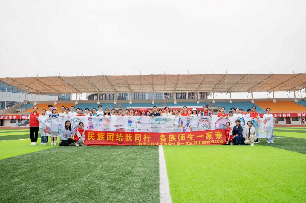 三月壮乡,歌舞飞扬;和谐八桂,欢庆佳节。为全面贯彻落实党的二十大精神和中央民族工作会议精神,进一步加强民族团结进步教育,铸牢中华民族共同体意识,同时弘扬壮族优秀民族文化传统、体验“壮族三月三”民族文化。4月20日,数学与统计学院在我校东校区西田径场开展“民族团结我同行,各族师生一家亲”暨“铸牢中华民族共同体意识”主题教育活动,该院党委书记庞伟、党委副书记李秀英、党委专职组织员陈金梅、辅导员和班主任等出席活动,学生第一党支部党员与应用统计学2020团支部全体团员参加活动,活动由团委书记周美艳主持。