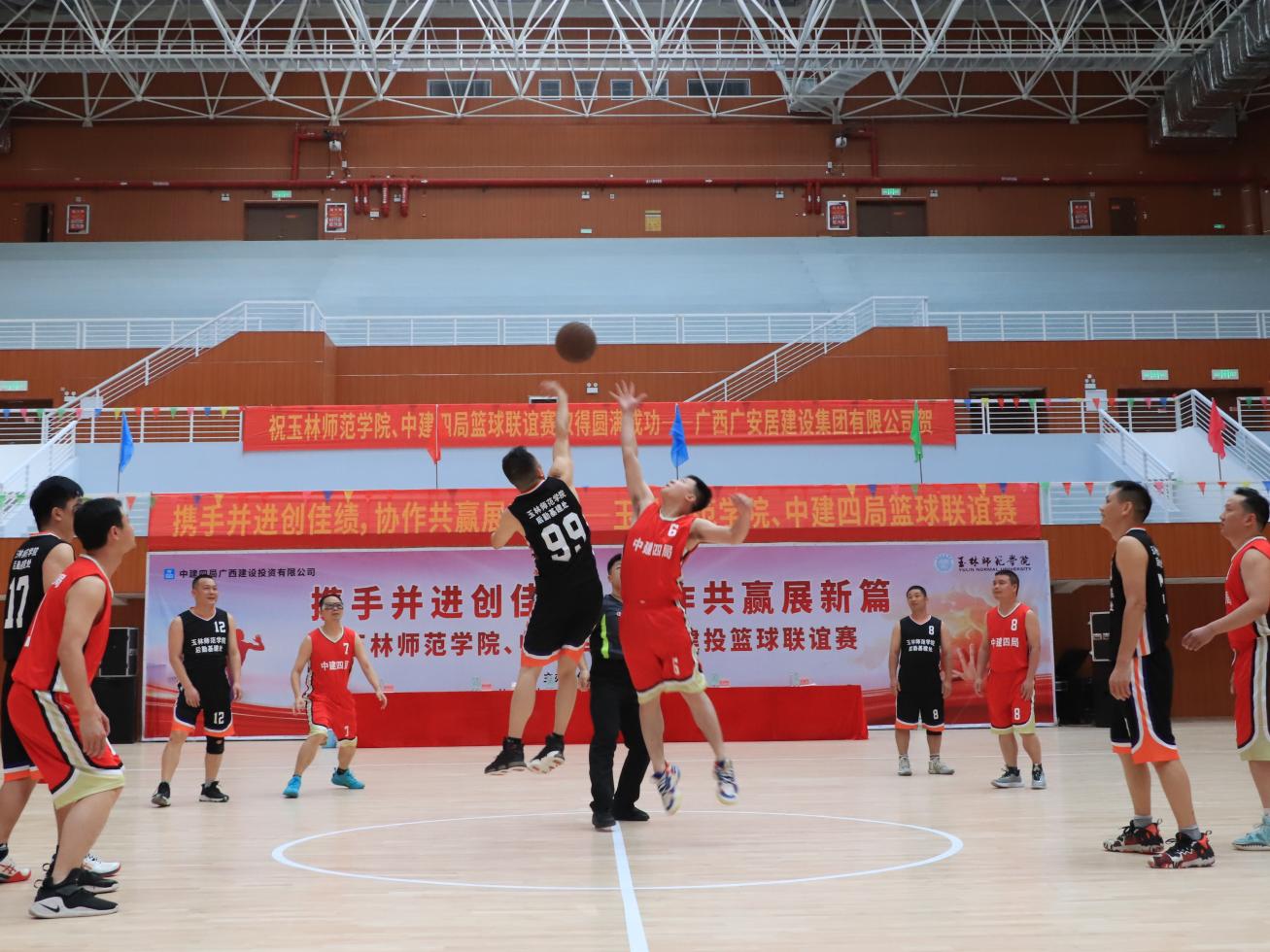 4月26日,我校与中建四局广西建设投资有限公司开展篮球联谊赛在我校举办。作为承接第一届全国学生(青年)运动会玉林市赛区篮球锦标赛的我校东校区体育馆也正式“登台亮相”,迎来“首秀”。