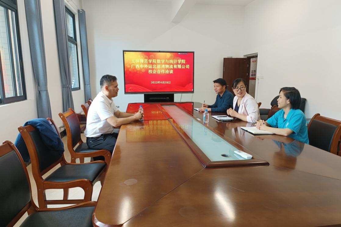 4月28日,广西中外运北部湾物流有限公司办公室主任王天德等一行到数学与统计学院考察交流,并就产教融合、专业实习、就业指导、创新创业项目等领域合作事宜进行深入交流。该院党委副书记李秀英、副院长杨京开及辅导员出席会议。