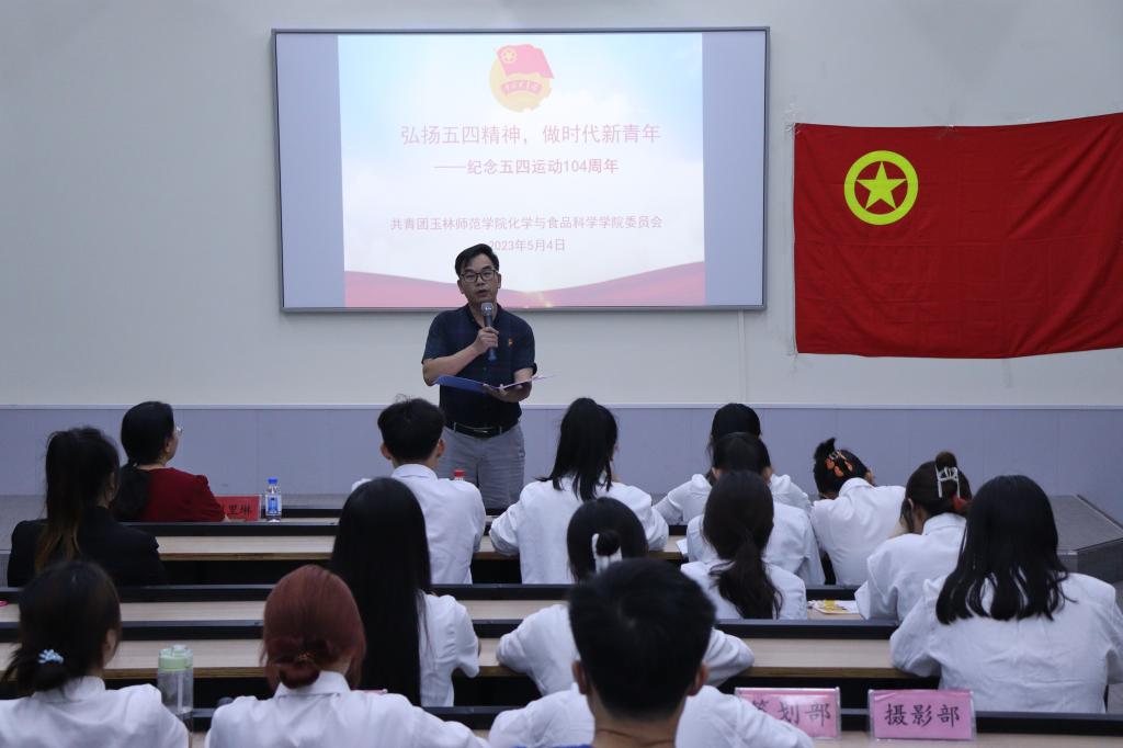 为了缅怀五四运动先驱崇高的爱国情怀和革命精神,弘扬五四精神,激励广大青年增强时代责任感和使命感,5月4日下午,化学与食品科学学院于我校东校区化阶教室开展以“弘扬五四精神,做时代新青年”为主题的纪念“五四运动”104周年主题活动,该院党委书记罗志辉、党委副书记刘里琳等领导教师、学生干部代表参加活动。