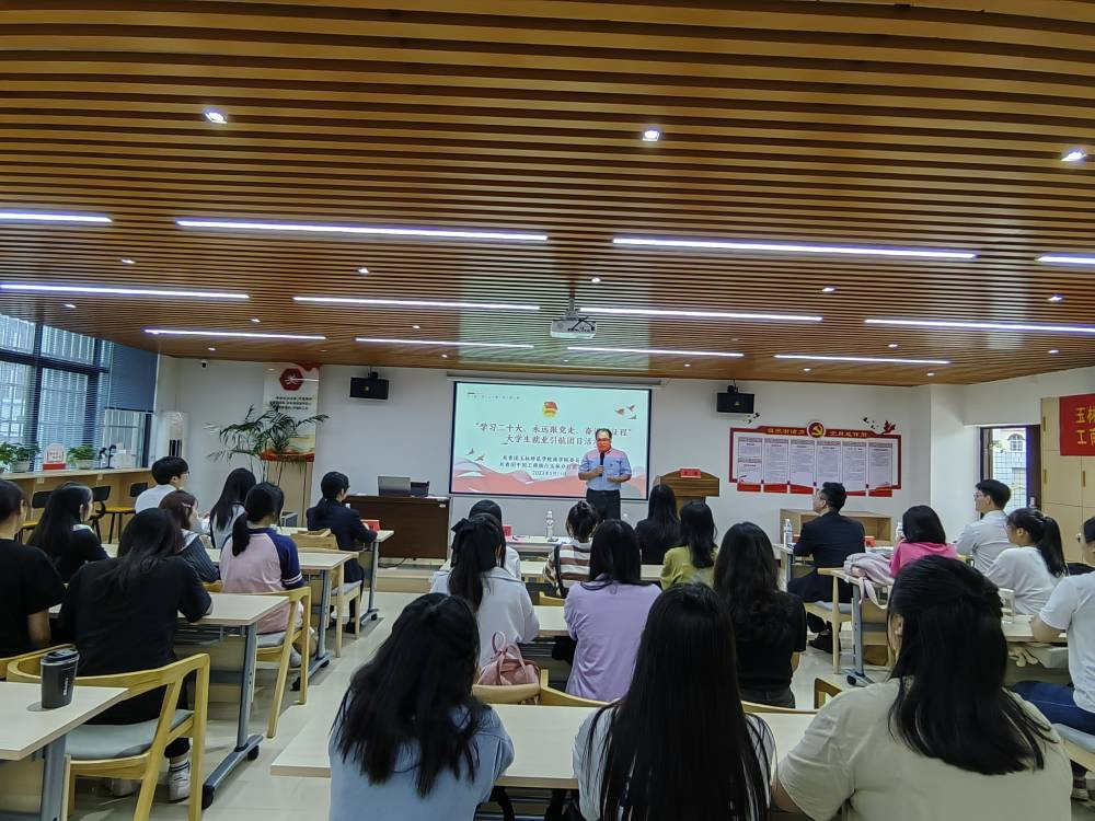 为深入贯彻落实党的二十大精神,进一步推进实施“共青团促进大学生就业行动”,5月11日,我校商学院、工商银行玉林分行团委在东校区挂榜书院联合举办“学习二十大、永远跟党走、奋进新征程”大学生就业引航团日活动。出席本次活动的有工商银行玉林分行个人金融业务部副总经理兼团委书记沈洋、人力资源部副总经理杨榜,商学院党委副书记兼副院长龙强、商学院团委书记李晓丽以及市场营销201班团支部的全体学生。