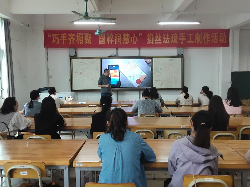 为提升学工队伍的素质能力,加大非物质文化遗产传播普及力度,激励学工队伍踔厉笃行,5月12日下午,学工处联合美术与设计学院于该院实训室409室开展掐丝珐琅手工制作活动。学工处处长杨潇、副处长文丽出席活动,学工队伍全体女教师参加活动。