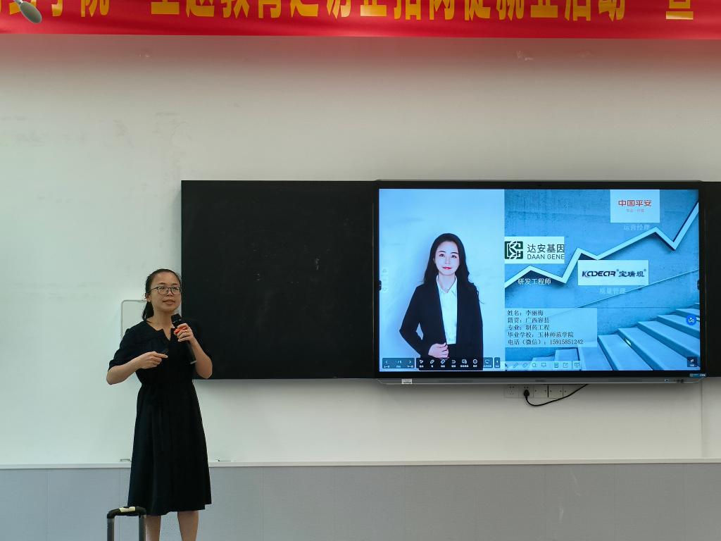 各位优秀校友回顾在完美(中国)学习、生活的美好时光,讲述自己励志勤学、刻苦钻研、自立自强的学习经历。随后,校友邹芸芸组织观看江苏恒瑞医药股份有限公司宣传视频,并从公司概况、研发体系、人才培养方案、岗位需求等方面进行了宣讲。校友李丽梅、吴海连依次向学生们分享各自工作经历、工作动力和职业感悟,鼓励感兴趣的学生们加入公司团队,共同努力奋斗。