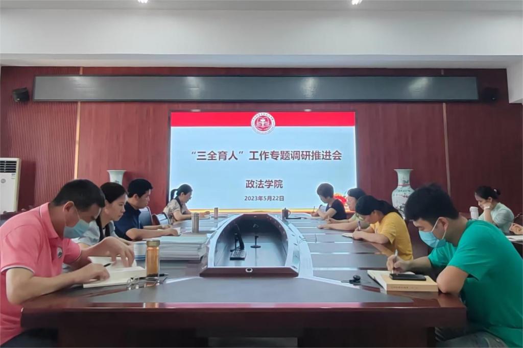 为进一步学习贯彻习近平新时代中国特色社会主义思想主题教育有关深入开展专题调研的工作要求,深化“三全育人”综合改革工作及示范院系申报工作,5月22日下午,政法学院于我校东校区明德楼508会议室召开主题教育“三全育人”工作专题调研推进会暨集体座谈会。该院党委书记梁修杰及领导班子、行政教辅人员参加此次会议。会议由梁修杰主持。