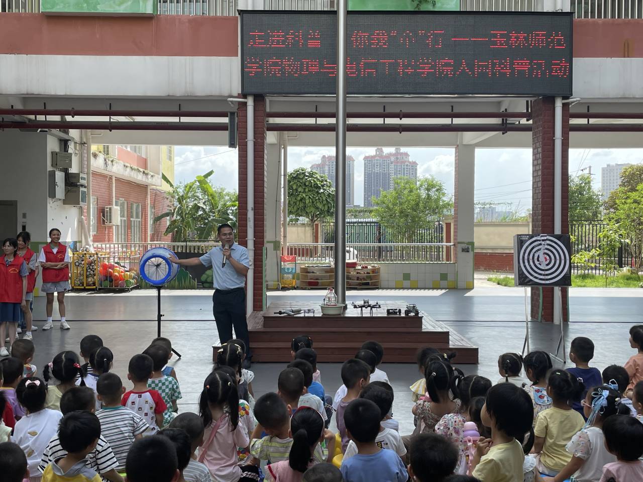 为了激发少年儿童爱科学、学科学、用科学的热情,从小培养他们的科学素养、创新意识和实践能力,5月26日下午,物理与电信工程学院党委副书记赵坚、副院长巫钊带队走进玉林市玉东新区第一幼儿园开展“格物笃行”党建品牌活动之科普进校园。该院辅导员代表、学生党员志愿者参加活动。