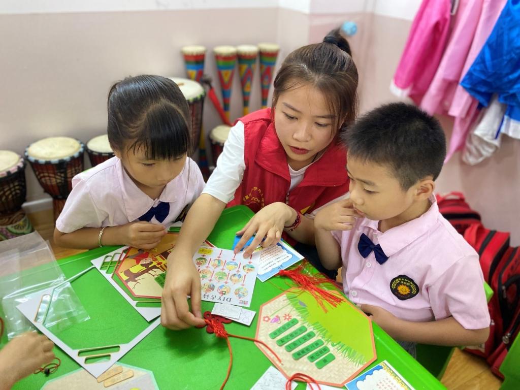 手工制作古诗贴画,增强文化自信。志愿者们先介绍古诗作品,和小朋友们一起朗诵古诗,小朋友们也纷纷进入状态,小耳朵仔细倾听着,小嘴巴大声读着。介绍完诗词之后,志愿者们拿出准备的手工材料,讲解古诗贴画的制作过程。小朋友们在志愿者的指导下,将零件巧妙进行粘贴组合,将《悯农》《春晓》《游子吟》等一首首朗朗上口的经典古诗所描绘的场景用双手粘贴出来。古诗词是中华文化的瑰宝,也是世界文化艺术宝库中一颗灿烂的明珠,一首诗就是一幅画。传统文化与现代工艺的完美结合,使得诗词文化变得鲜活起来,小朋友在动手体验手工乐趣的同时也体会了中国古诗文化的魅力!创作结束后,小朋友们纷纷表示这贴画太漂亮了,要将这个贴画带回家给家人分享,还要把古诗背给家人听。