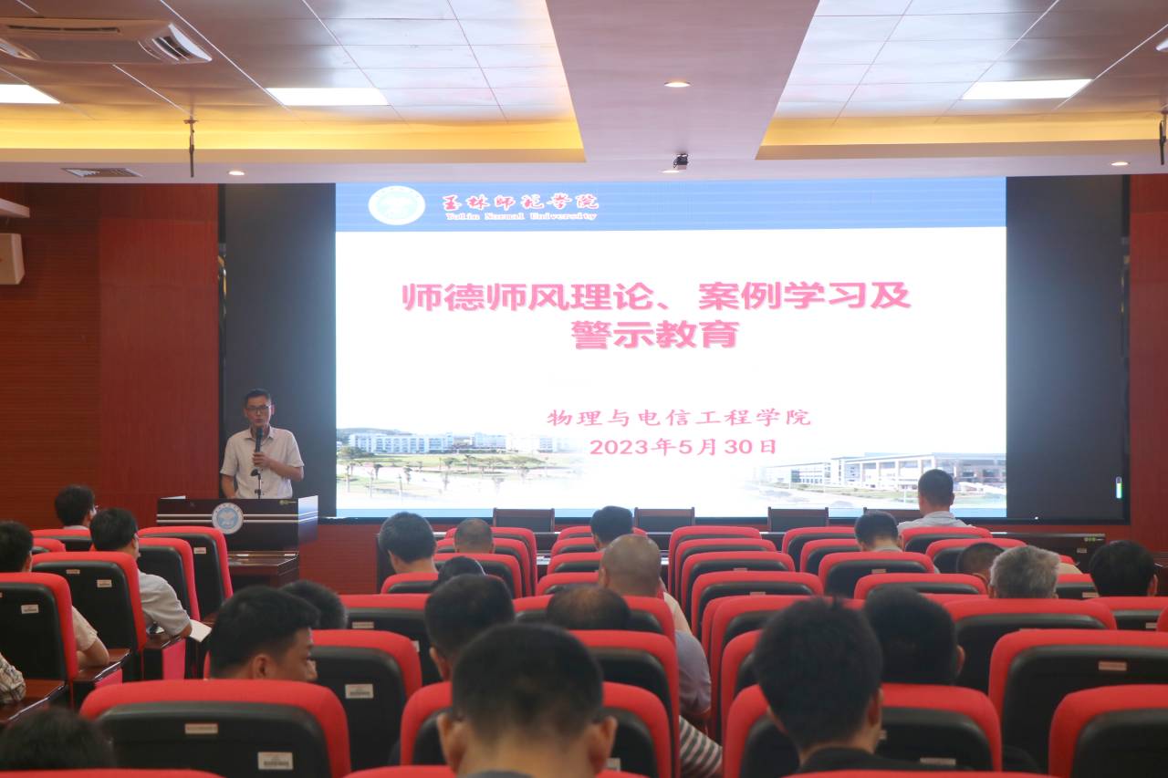 为加强学院师德师风建设,引导广大教师涵养高尚师德,遵守师德规范、师德底线,5月30日下午,物理与电信工程学院在完美(中国)东校区教师能力发展中心401-402室召开2023年教职工师德师风理论、案例学习及警示教育会。该院领导班子、全体教职工参会,会议由党委书记廉文武主讲。