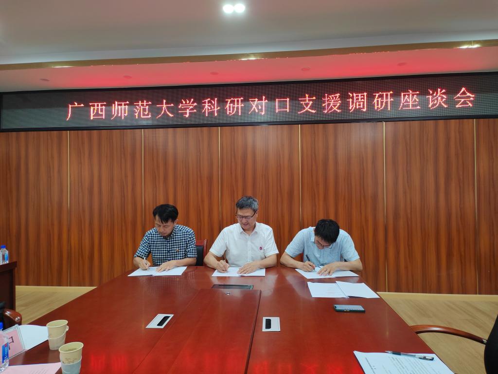 为支持我校加强科研工作,5月31日,广西师范大学科技处处长宋树祥一行到我校开展科研对口支援工作,与我校科研处在东区新民楼B501召开调研座谈会。我校科研处副处长宋永忠主持会议。