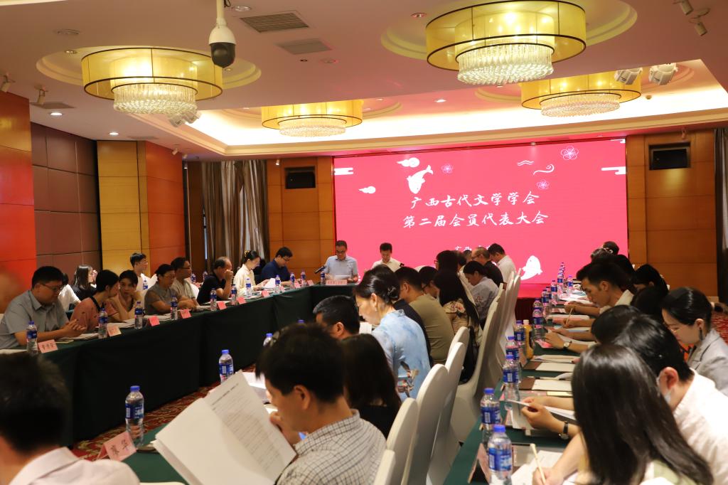 6月3日上午,广西古代文学学会第二届会员代表大会暨第二届理事会第一次会议在南宁荣荣大酒店举行,来自广西大学、广西民族大学、南宁师范大学、广西科技师范学院、广西民族师范学院、广西外国语学院、玉林师范学院、百色学院、河池学院、贺州学院、南宁职业技术学院、广西社会科学院、广西区党委编办、广西宏桂集团的48名会员代表参会。自治区社科联党组成员、副主席杨东星、自治区社科联办公室主任杨辉、自治区社科联学会部章琳、广西日报社记者农云海、广西民族报社汉文编辑部主任黄浩云、南宁晚报社记者李宗文、广西民族传统文化学会副会长苏海帆应邀出席。