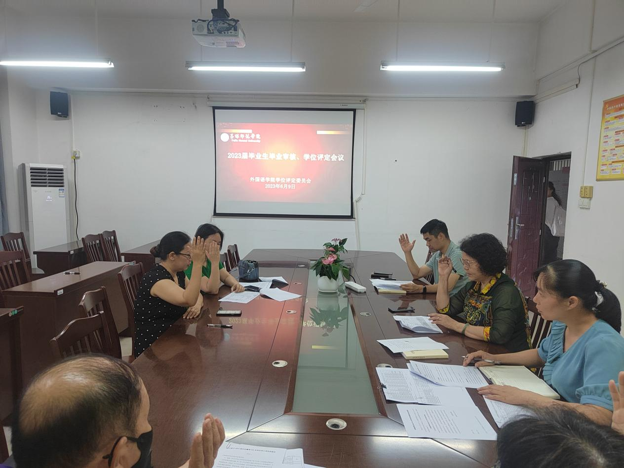 6月9日,外国语学院于我校东校区厚德楼1-306会议室召开2023届毕业生毕业审核、学位评定会议。外国语学院学位评定委员会成员参加会议,会议由教学秘书主持。
