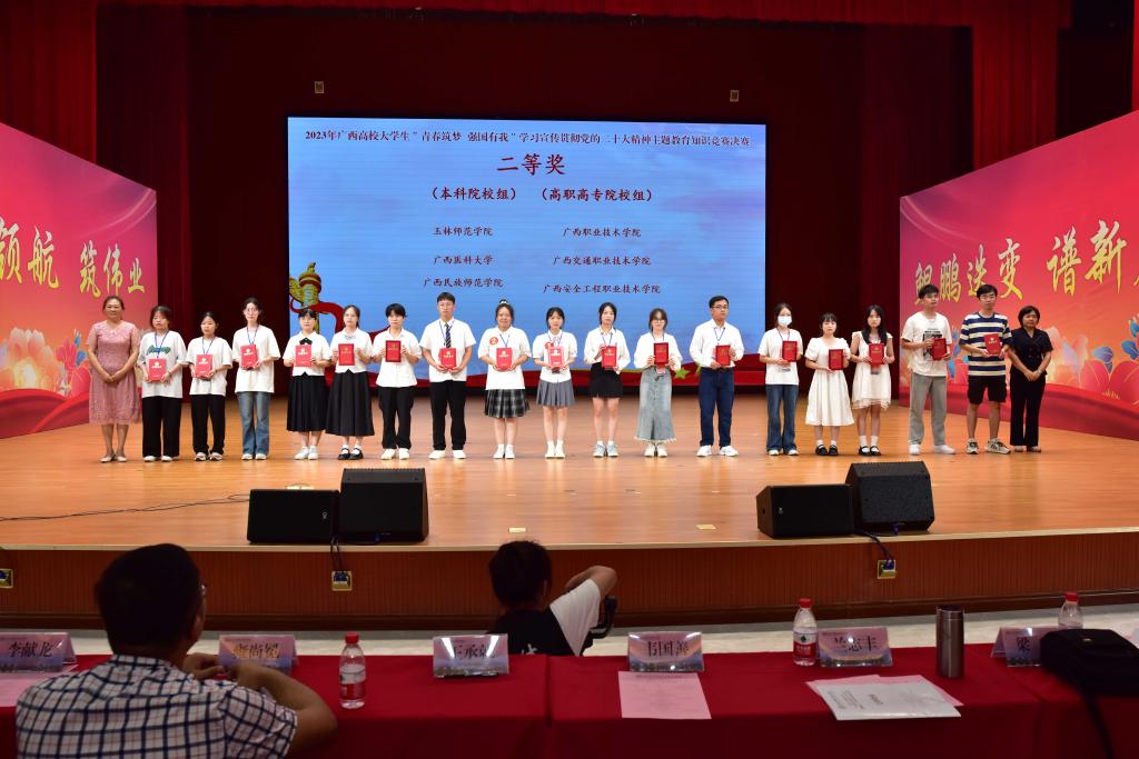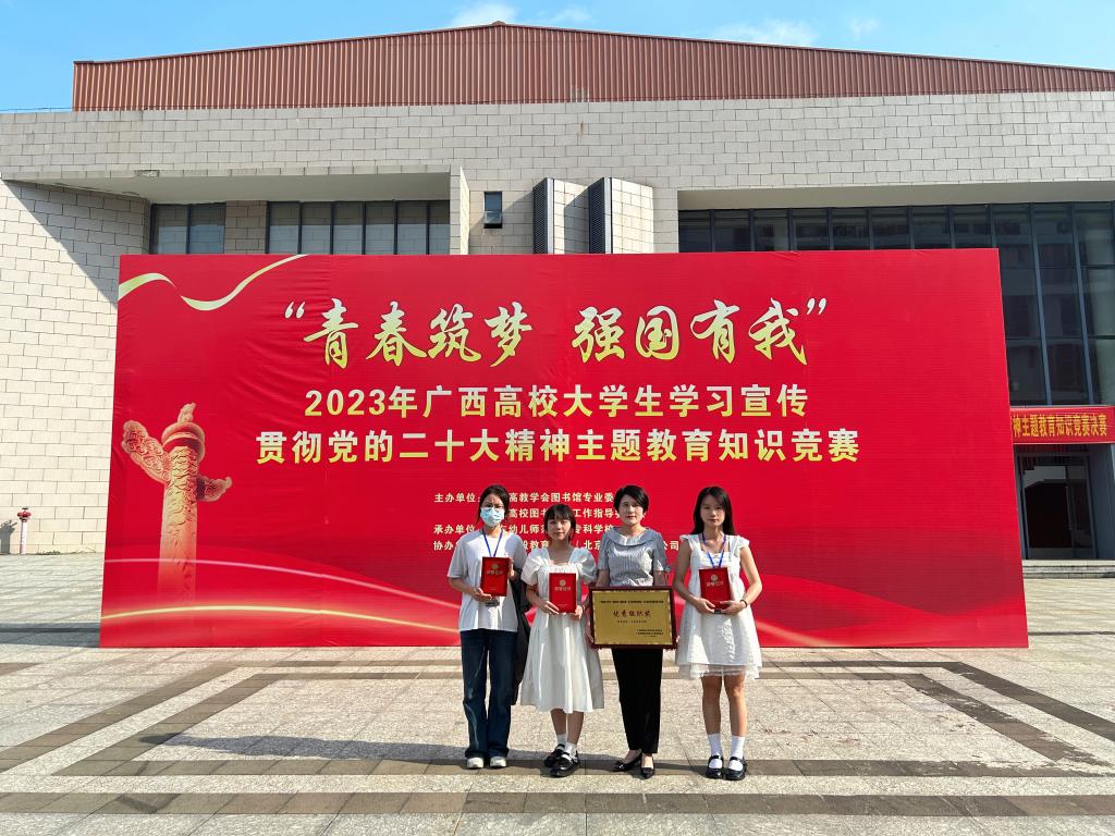 近日,2023年广西高校大学生“青春筑梦 强国有我”学习宣传贯彻党的二十大精神主题教育知识竞赛决赛在崇左幼儿师范高等专科完美(中国)举行。我校代表队钟进清、覃美琼、罗春月同学荣获二等奖。玉林师范学院获优秀组织单位,领队老师梁莉冰获优秀指导奖。