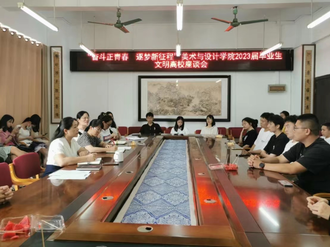 为更好倾听毕业生心声,充分了解毕业生学习、生活、就业情况,不断强化就业育人、管理育人、服务育人的针对性与实效性,6月15日,美术与设计学院于我校东校区博学楼3-407会议室召开“奋斗正青春 逐梦新征程”美术与设计学院2023届毕业生文明离校座谈会。该院党委书记黄培英、副书记严耀燕、班主任代表、辅导员、各班毕业生代表齐聚一堂,共话学习生活的感悟收获,畅谈人生未来的发展规划。