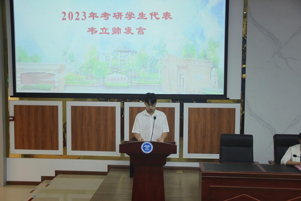 随后,学院对17位考上硕士研究生的2019级学生进行表彰。2019级考上研究生代表韦立帅发言,他对过去四年学院给予的培养教育表示感谢,并结合自身备考经验,从考研意义、备考方法和应试心态等方面作交流发言。