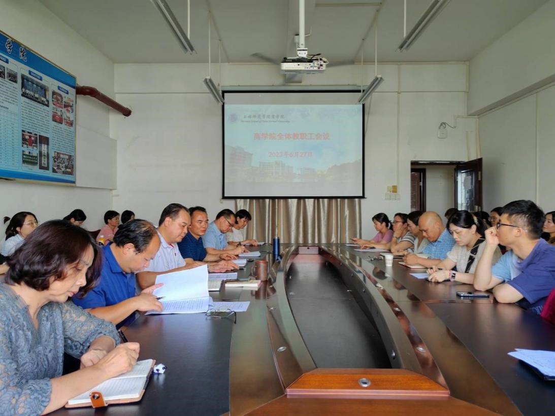 6月27日,商学院于我校东校区博学楼1-407会议室召开2023年全体教职工会议。该院领导班子成员及全体教职工参加此次会议。会议由该院党委书记管金标主持。