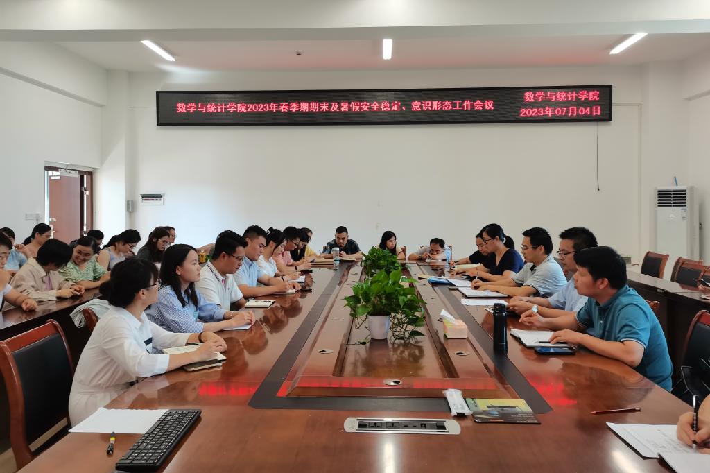 7月4日,数学与统计学院于我校东校区新民楼C408会议室召开2023年春季期期末及暑假安全稳定、意识形态工作会议。会议由党委书记庞伟主持,副院长王培(全面主持行政工作)等领导班子及全体教职工参加。
