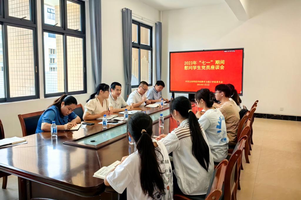 为了庆祝中国共产党成立102周年,深入学习贯彻习近平新时代中国特色社会主义思想和党的二十大精神,7月5日,数学与统计学院在新民楼红数林之家组织召开“七一”期间慰问学生党员座谈会,为学生党员送去问候与关怀。学院党委书记庞伟、王培副院长(全面主持行政工作)等领导班子成员参加此次座谈会,会议由庞伟主持。